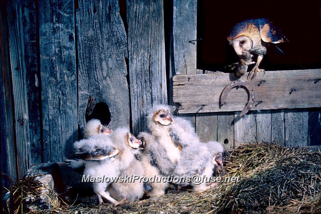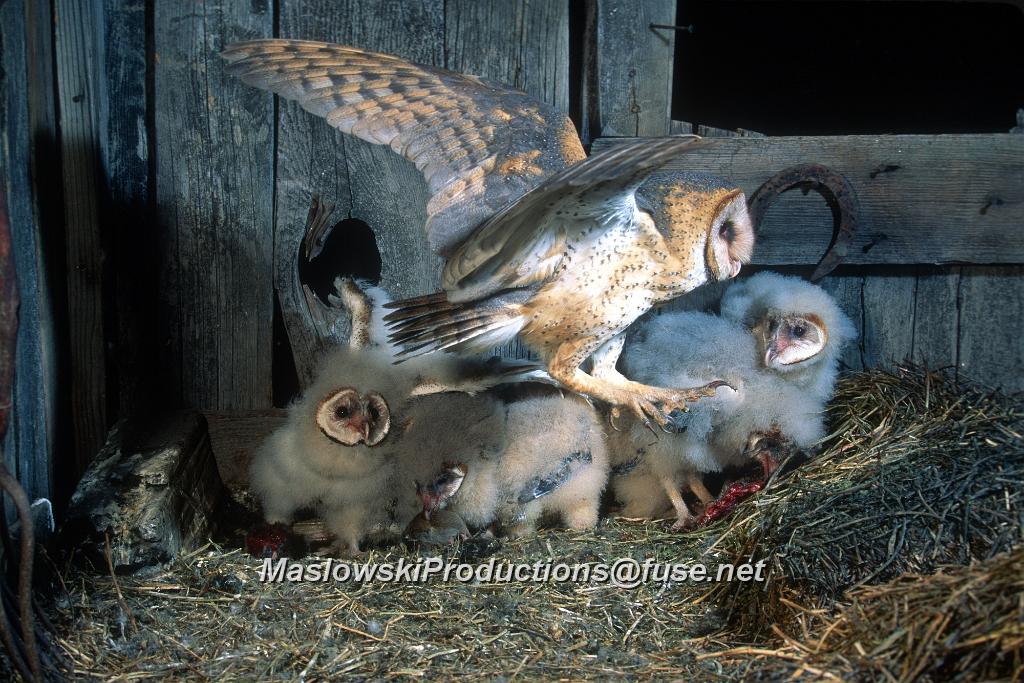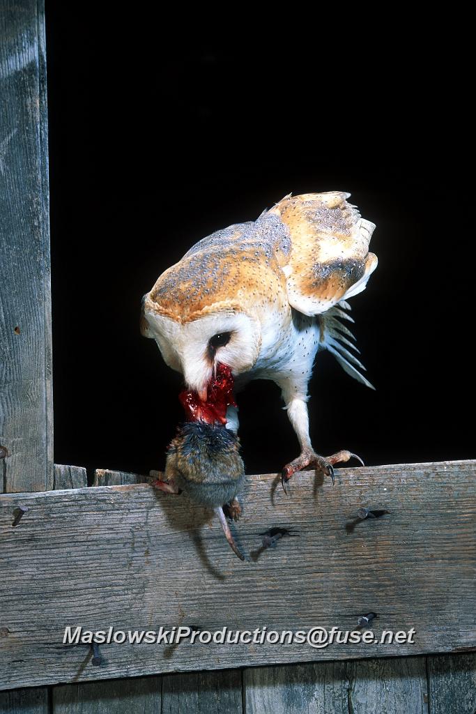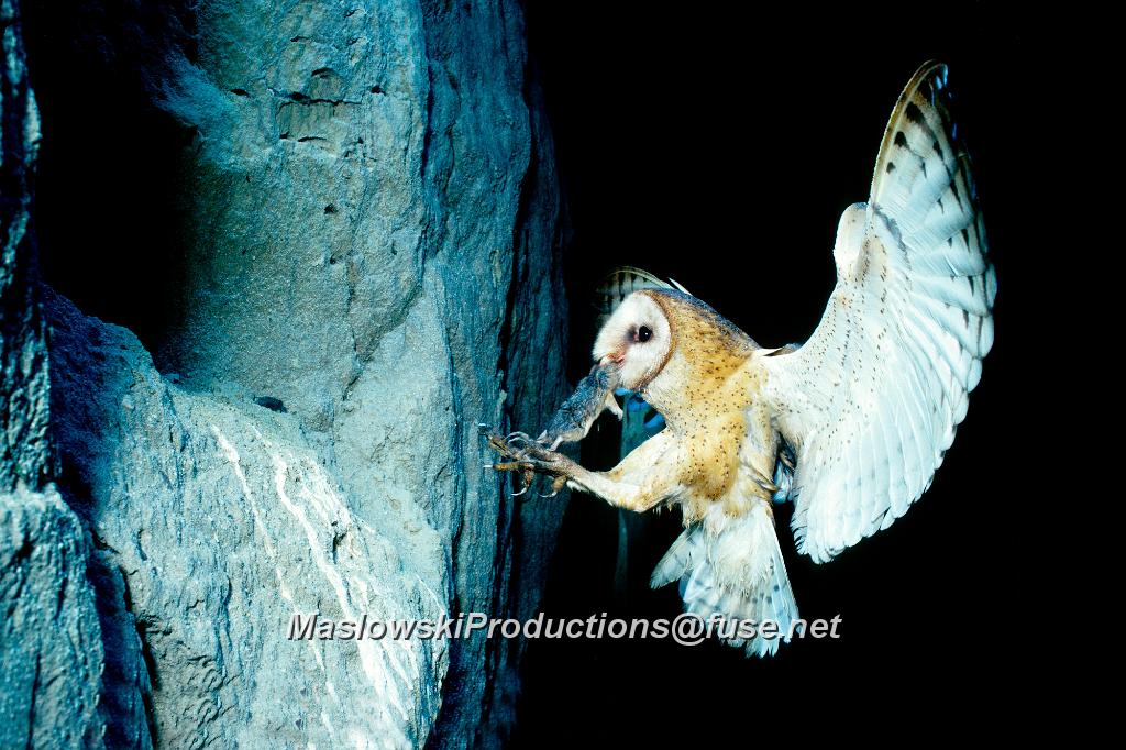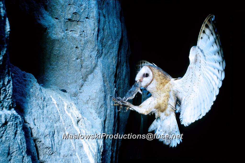 Owl, barn - delivering pocket gopher to nest in cliff BD 17048k