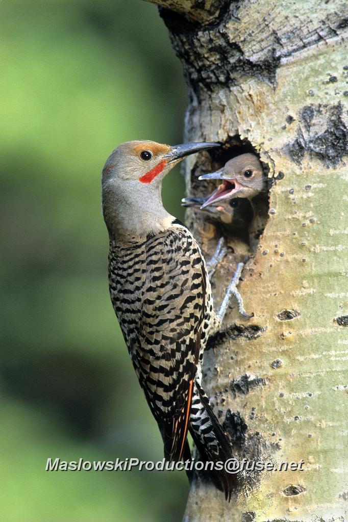 Flicker, northern (red-shafted) - male with nestlings in alder D 16-20572k